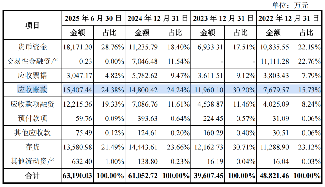 各期末,嘉德利应收账款跟着收入范围增加一连增加,从2022年7679.57万元增至2024年的1.48亿元,2025年6月末为1.54亿元,占各期滚动资产的15.73%、30.20%、24.24%、24.38%;同期,应收账款账面余额分手为8111.46万元、1.26亿元、1.56亿元、1.62亿元,占交易收入的比例分手为14.75%、23.89%、21.23%、44.14%。同时,其应收周转率从2022年7.01次/年降至2025年的4.62次/年,回款压力有所添加。