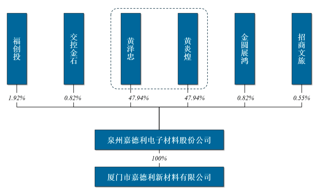 同时完整的尚有嘉德利股权构造,黄泽忠与黄炎煌两外兄弟持股比例各降至47.9442%,合计持股95.8884%,为配合控股股东、实质负责人。