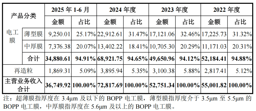 进一步细分来看,遵循差别厚度,其BOPP电工膜又分为超薄膜、薄型膜、中厚膜,个中超薄膜产物具有较为鲜明的先发上风,以及有更高的订价空间,向来功勋超四成收入。2022年-2024复合年均增加率为17.08%,跑赢整个营收大盘。